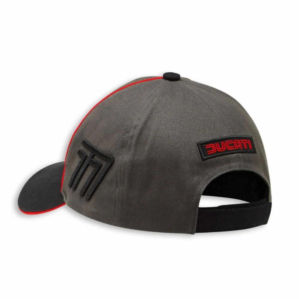 100% cotton baseball cap with 3D embroidery featuring Ducati text and a logo. Grey hat with black peak. Ducati text in white, with black and red accents.