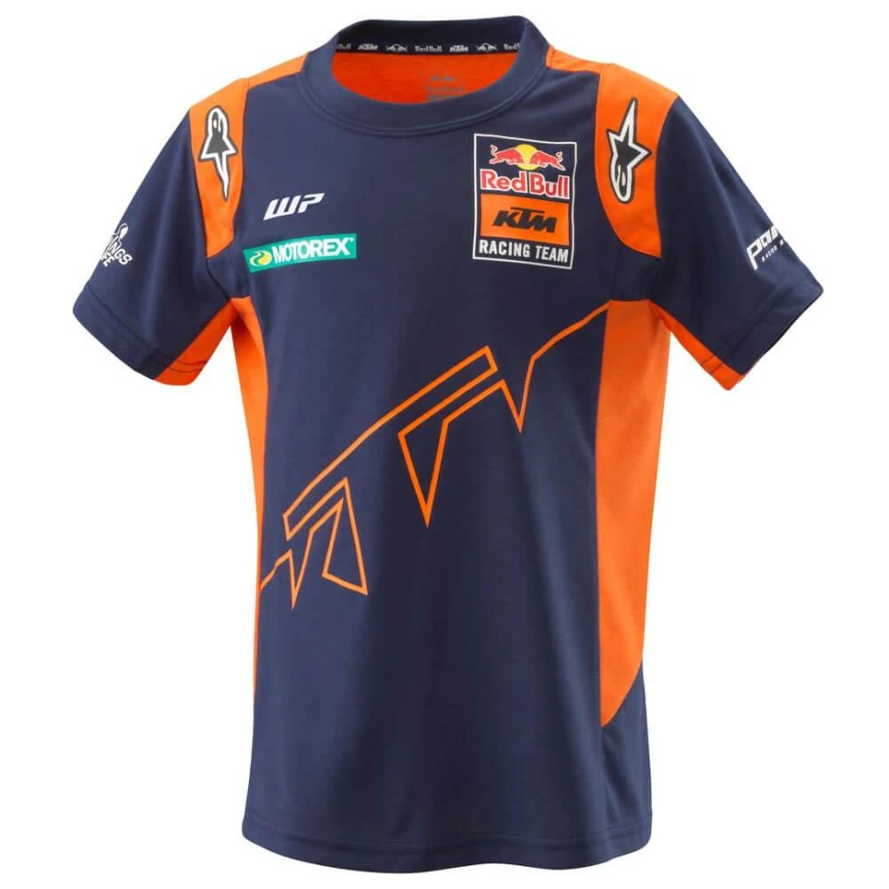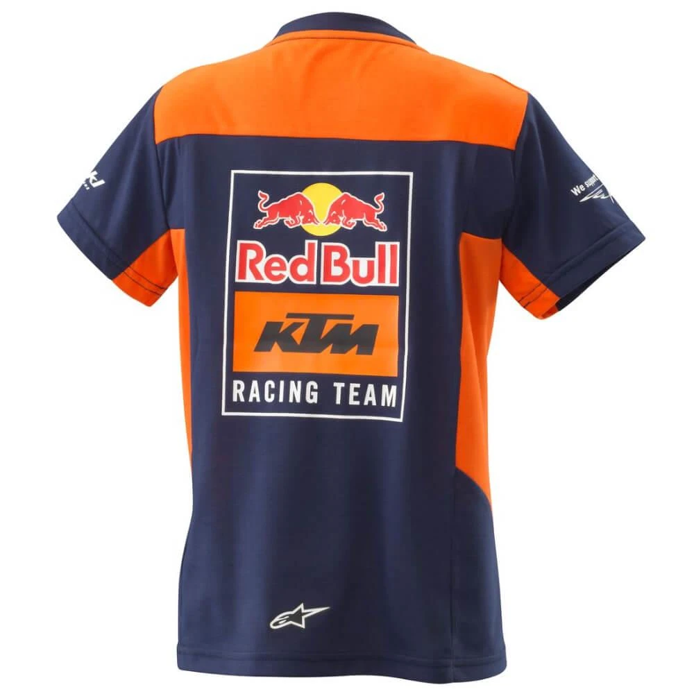 KTM Kids Replica Team Tee in dark blue with KTM orange details and featuring KTM Red Bull Racing Team logos on back and left of chest, Alpinestars and other sponsors logos throughout.