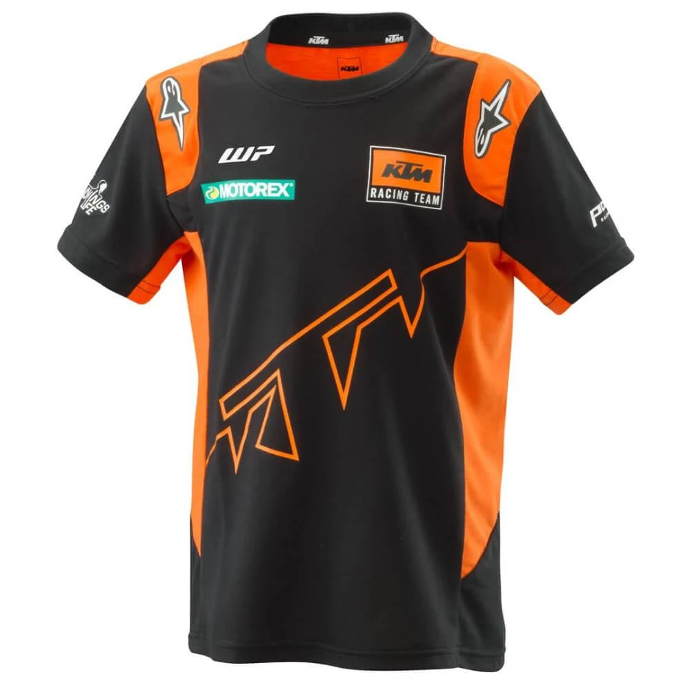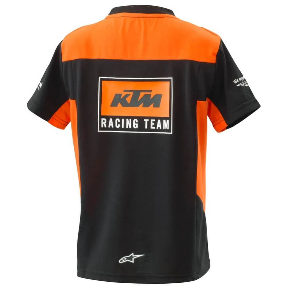 Genuine black KTM Racing Team kids t-shirt with KTM orange on shoulders and sides.