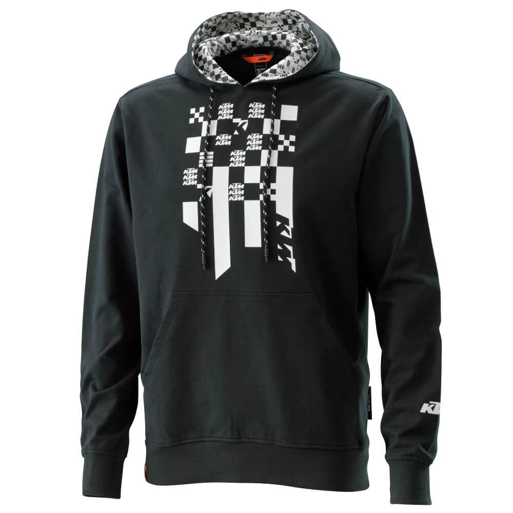 A Black KTM Radical Hoodie made from 100% cotton, featuring a checkered graphic design on the front, a similar checkered lining to the hood and KTM logo on the left sleeve