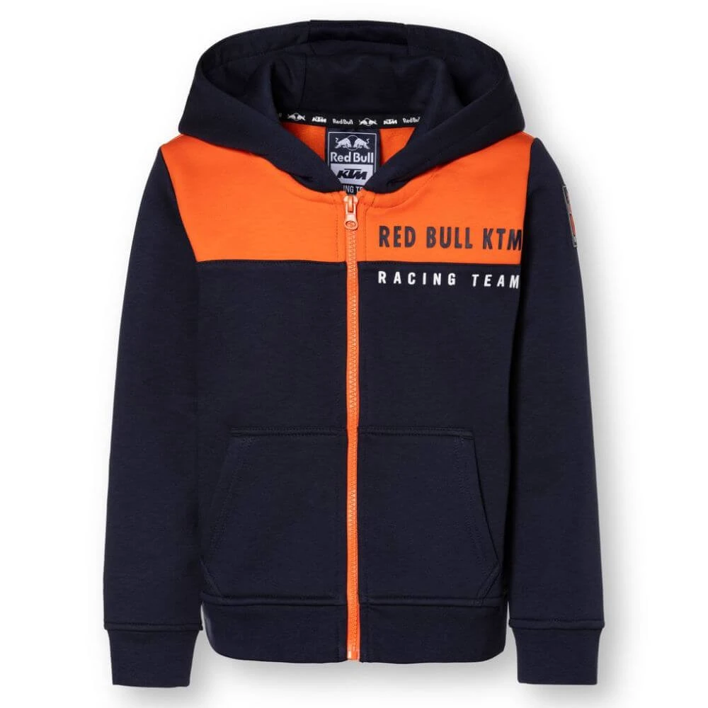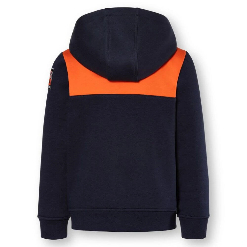This KTM Red Bull Racing Team Hoodie features a full-length zipper and hand-warmer pockets on the front in a dark blue and orange design, along with the official Red Bull Racing logo on the left arm.