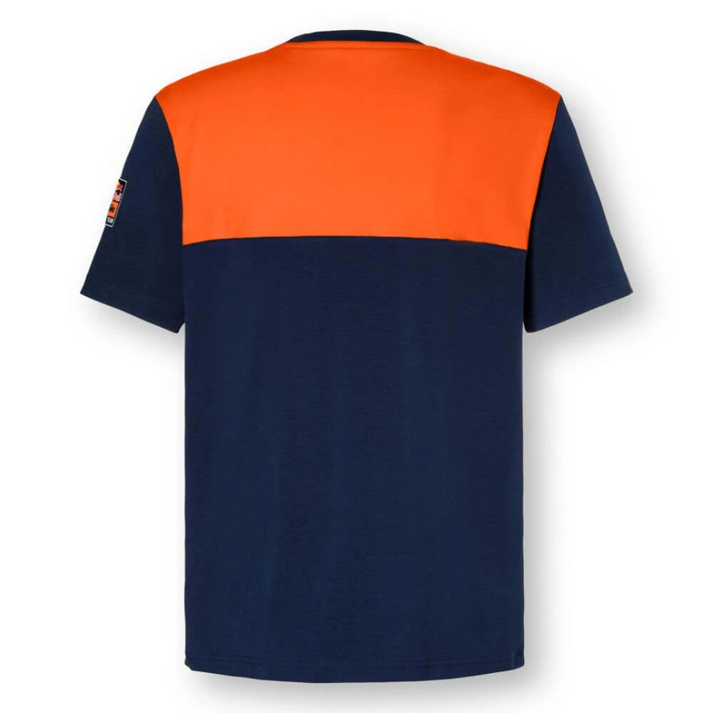 The Zone T-Shirt is an official Red Bull KTM Racing Team short sleeve tee featuring a distinct solid orange and blue block design, coupled with the Red Bull Racing logo on the left arm.