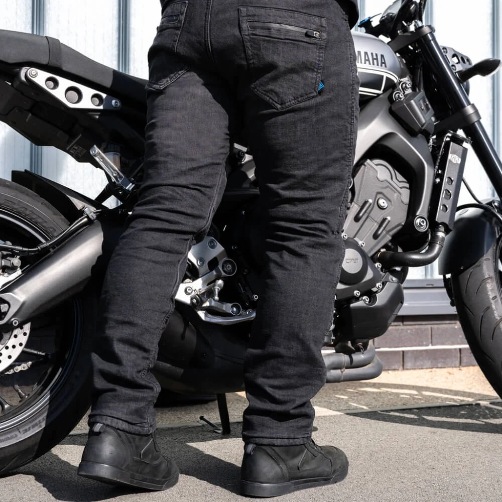 The Merlin Mason Waterproof Jeans Regular in Black are a sophisticated Route One denim piece, boasting an outer layer that repels water and a waterproof, breathable membrane behind its cotton construction. Prepared to face the elements, these jeans feature a slim fit and an urban aesthetic that offers reliable protection against impact, abrasion, and inclement weather.
