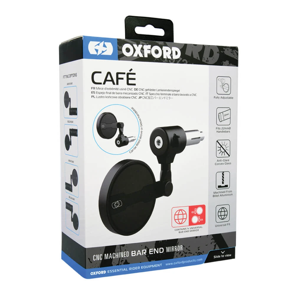 Crafted from high-grade billet aluminium, the Oxford Cafe Bar End Mirror Universal is an adjustable, glare-resistant convex mirror tailored to fit 22mm and 7/8″ handlebars.