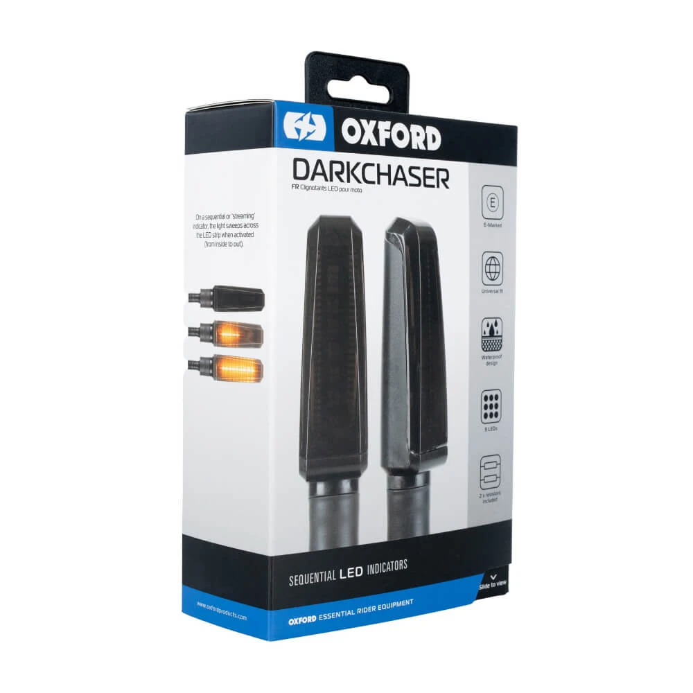 Oxford DarkChaser Sequential Indicators now feature a stylish dark smoked lens. When in use, the indicator illuminates the strip progressively from the core outward. With their universal fit, these indicators are ideal for any bike.