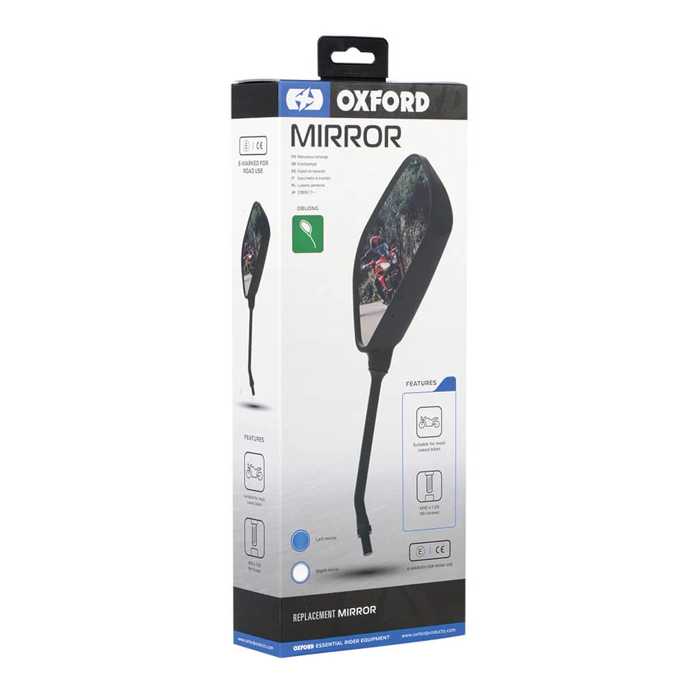 The Oxford Mirror Oblong Left is designed for compatibility with the majority of naked motorbikes, making it an ideal replacement mirror.