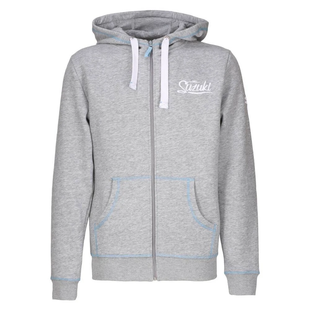 Grey mélange hooded full-zip sweat jacket with light blue stitching and embroidered logos.