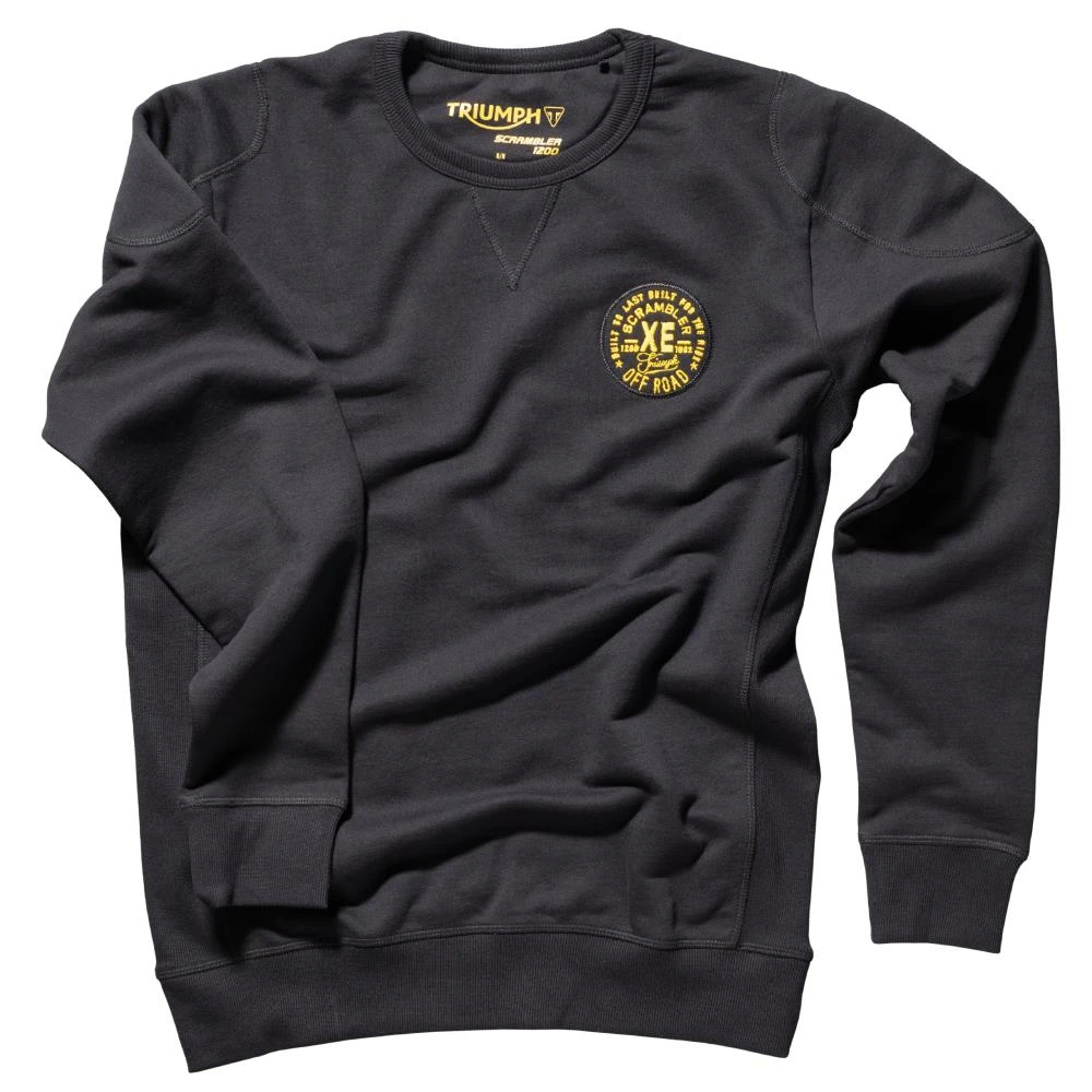 Triumph Black long sleeved Anstie sweater, featuring the Scrambler XE emblem in yellow stitching on a patch on left of chest.