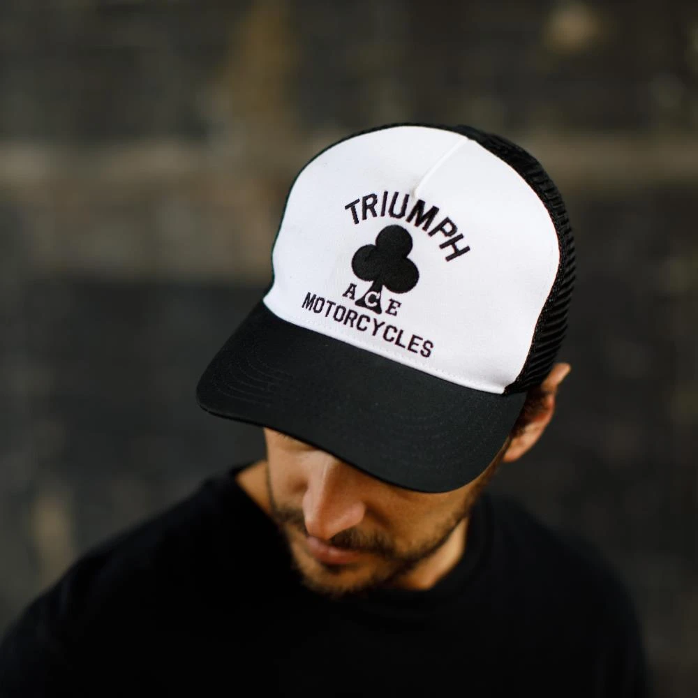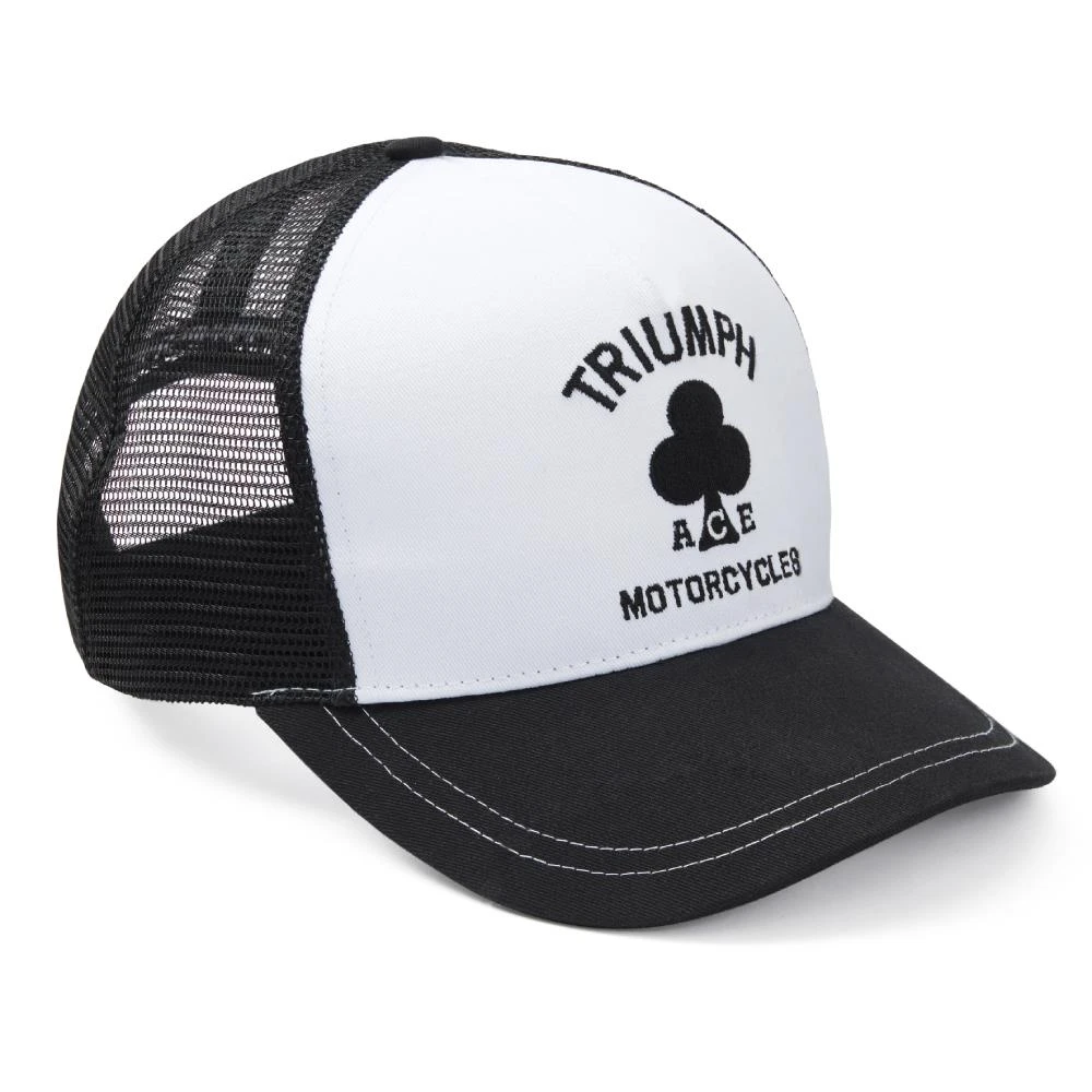 Genuine Triumph Ace Motorcycles trucker cap in black and white, featuring the Ace Cafe logo on the front.