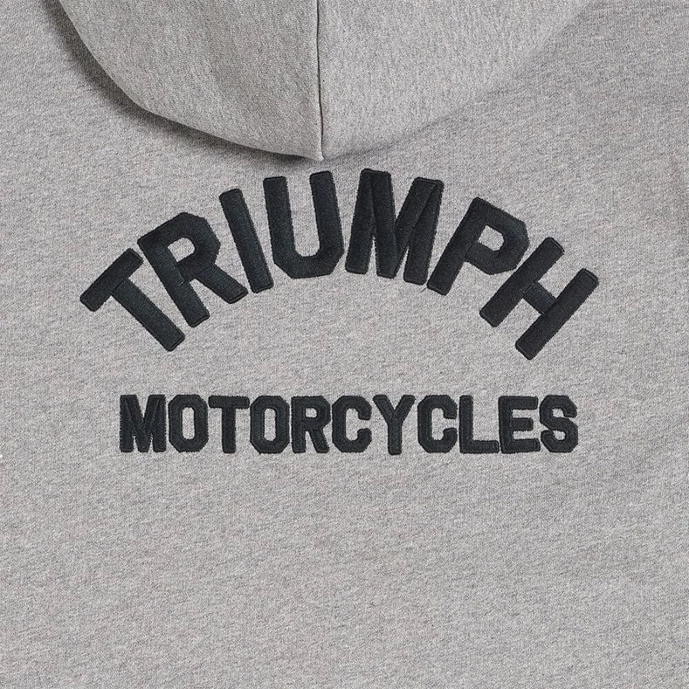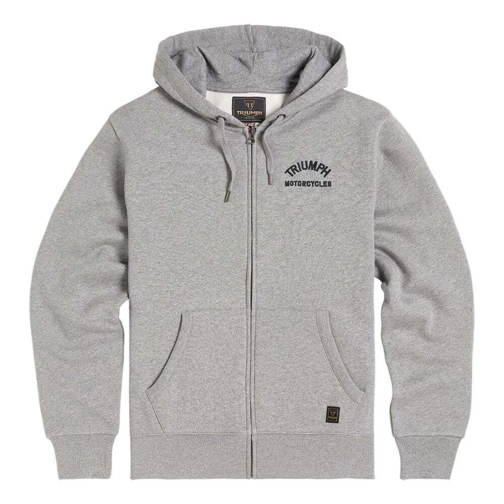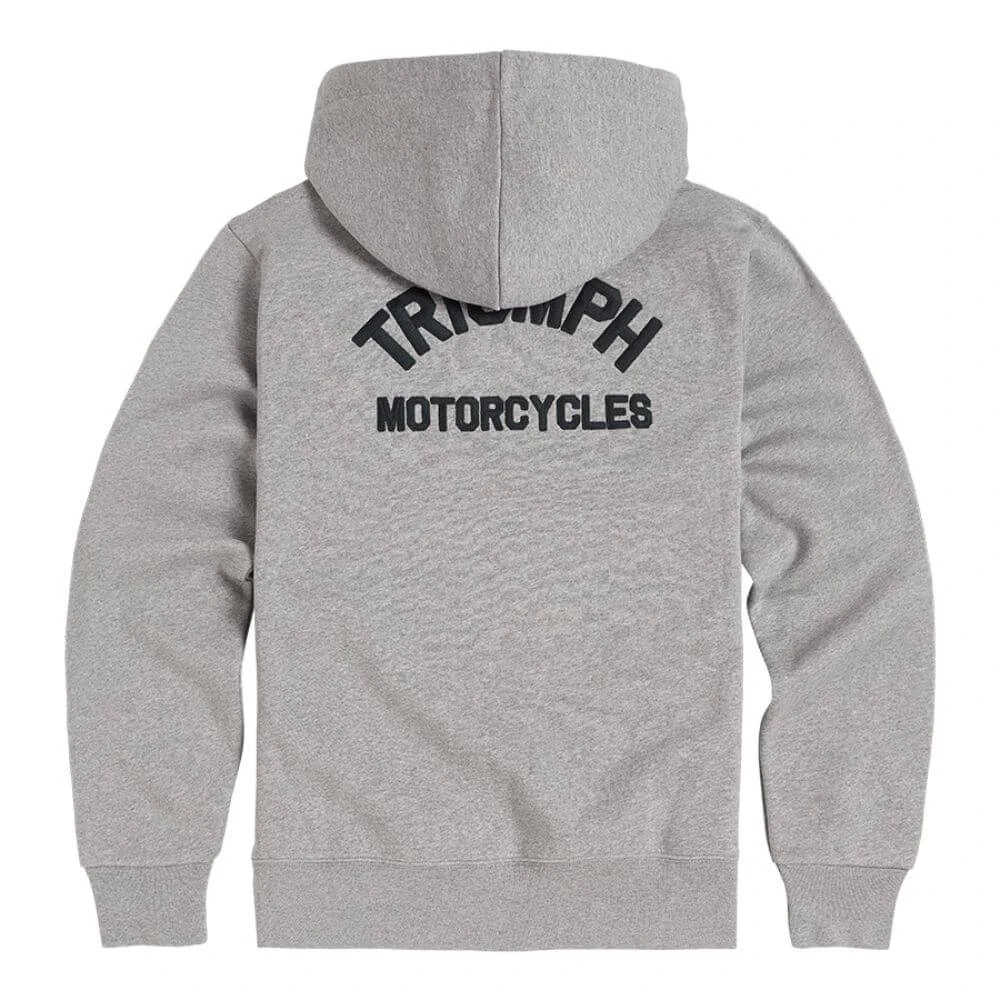 Fashioned with a heavyweight 360gsm fleece-back cotton construction, the Triumph Dolan hoodie sports an iconic Grey Marl hue, in addition to precise arched Triumph Motorcycles embroidered lettering in Bone, placed small on the left chest and large across the back, a full-length front zip, double kangaroo pockets, and drawstring hood.