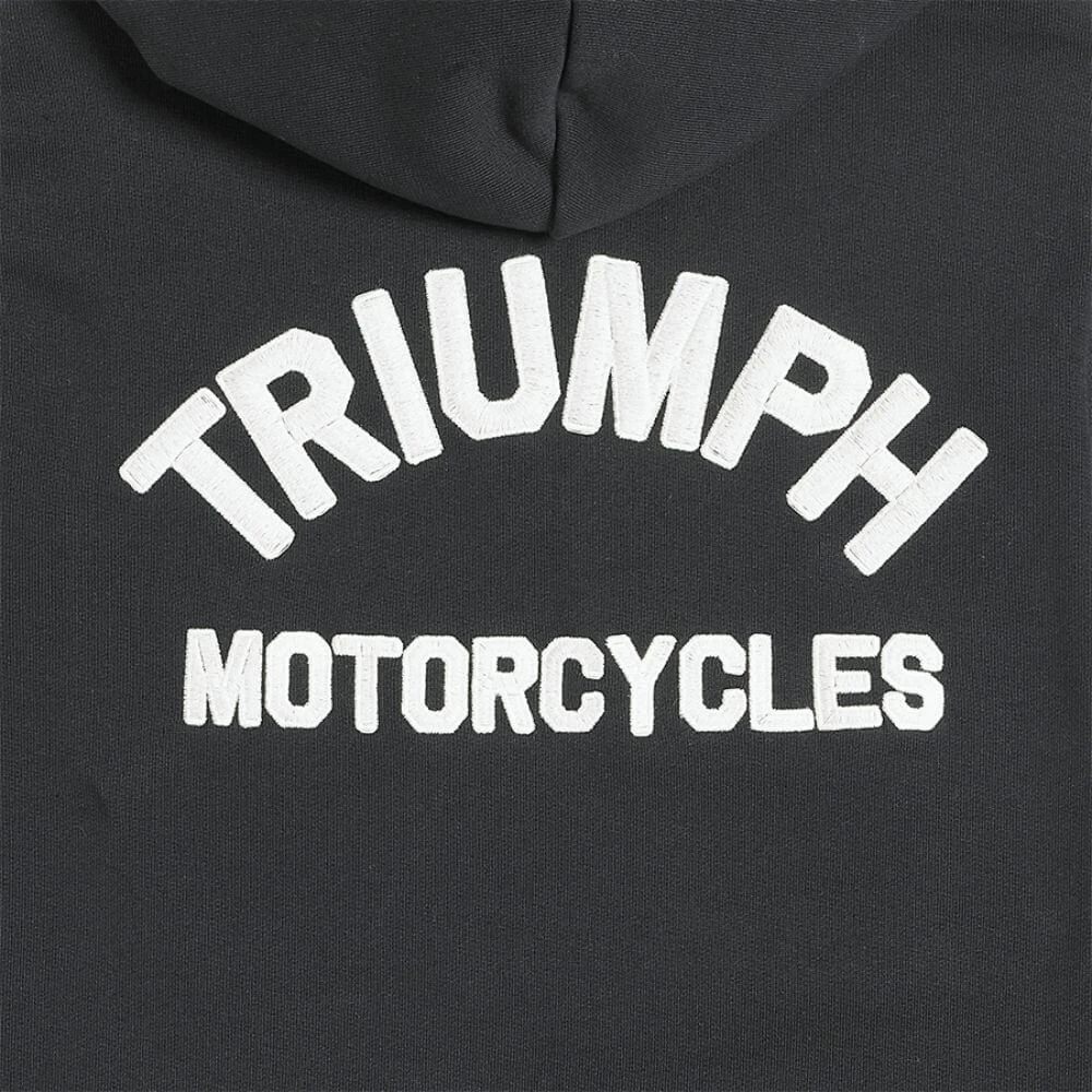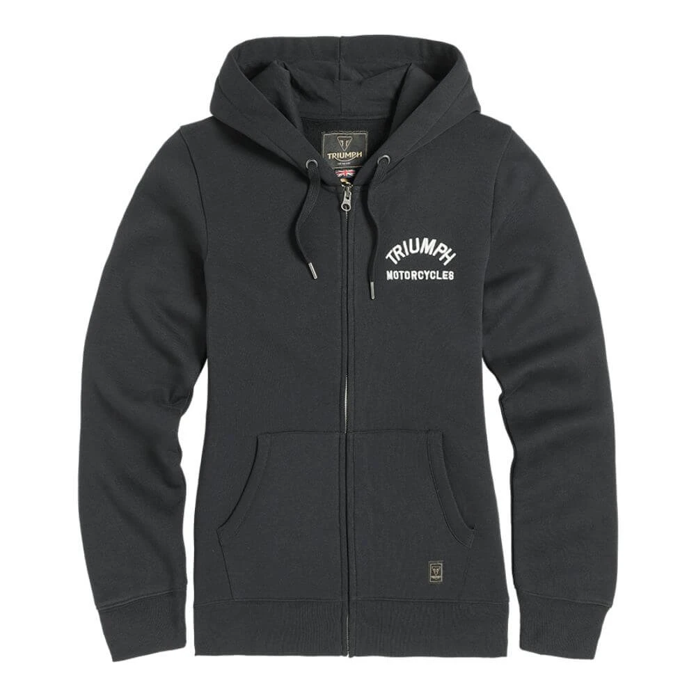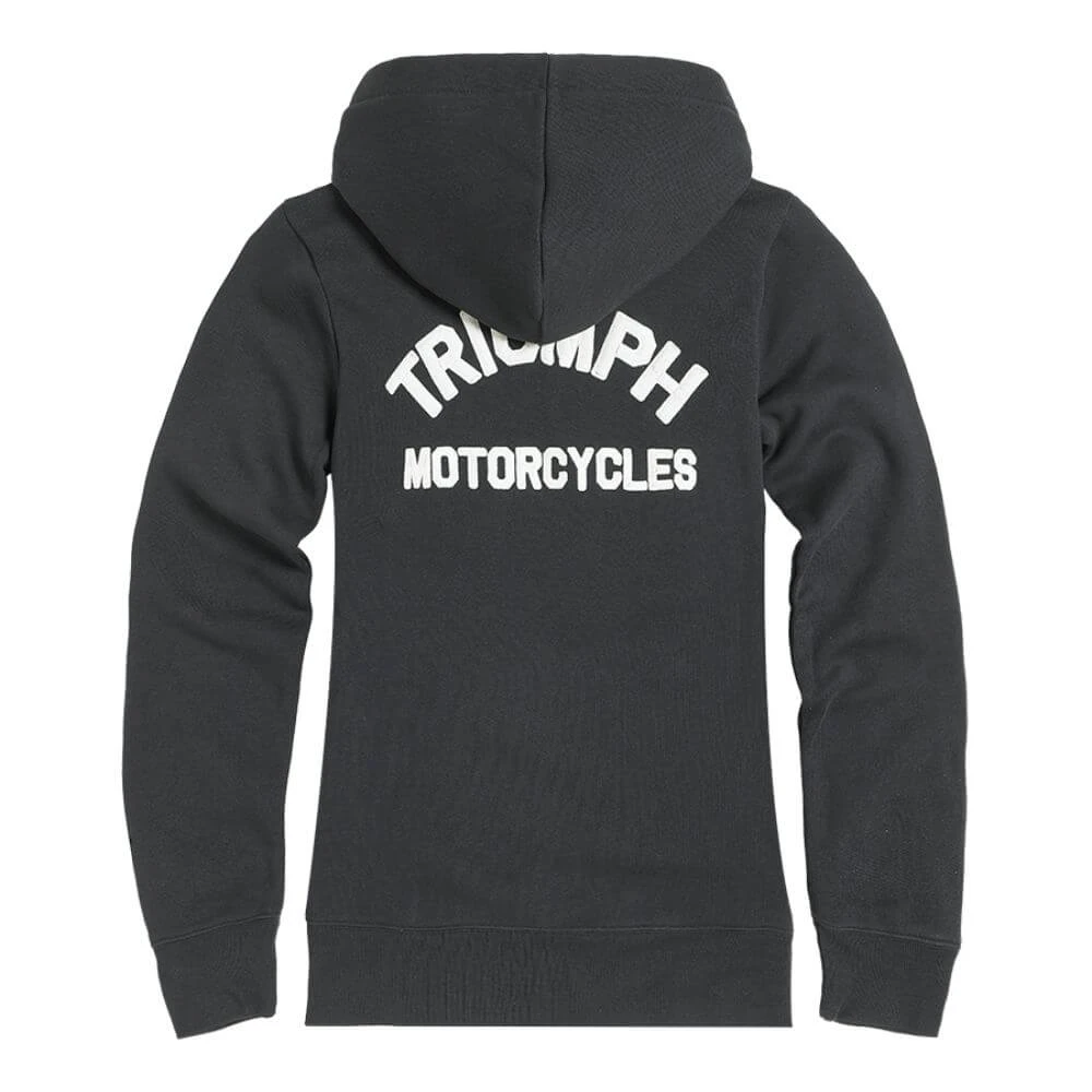Crafted from a heavyweight 360gsm fleeceback cotton, the Triumph Lilly is a Black women’s hoodie detailed with Triumph Motorcycles embroidered lettering in Bone. Its features include a small insignia on the left chest, a large logo across the back, a full length front zip, double kangaroo pockets, and a drawstring hood.