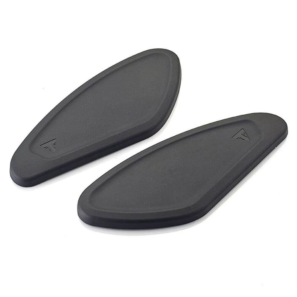 A durable, self-adhesive rubber knee pad, which offers additional protection to the side of the tank from scuffs and scratches and increasing rider comfort and grip. Features embossed Triumph logo detail.