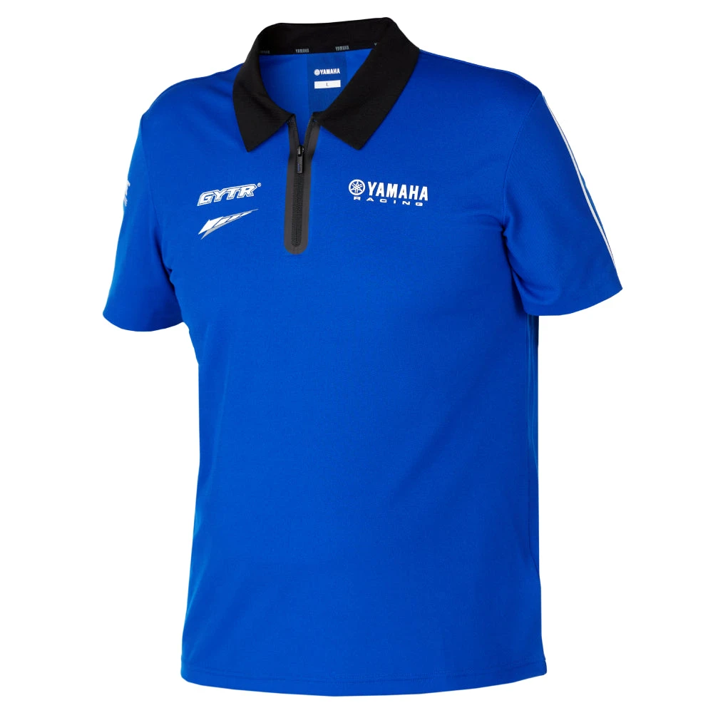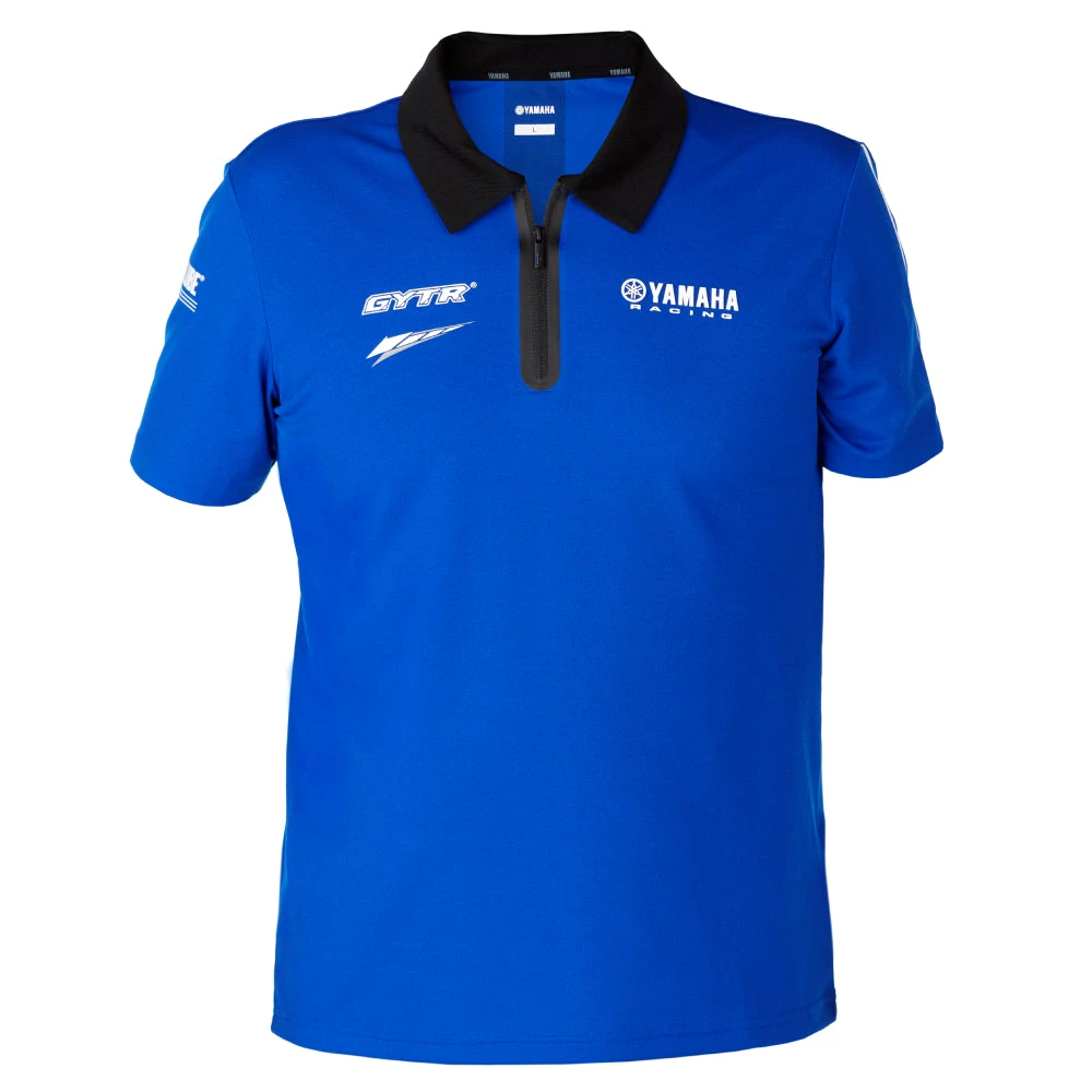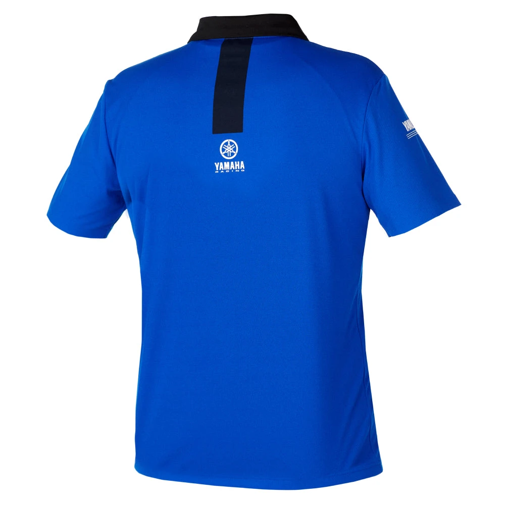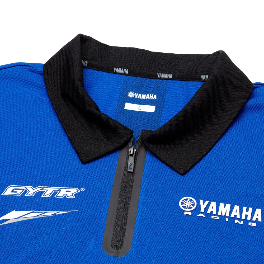 Men’s “paddock blue” polo shirt featuring Yamaha Racing text in white on the left chest. Black collar and zip front. White text on chest, right arm and top of the back.