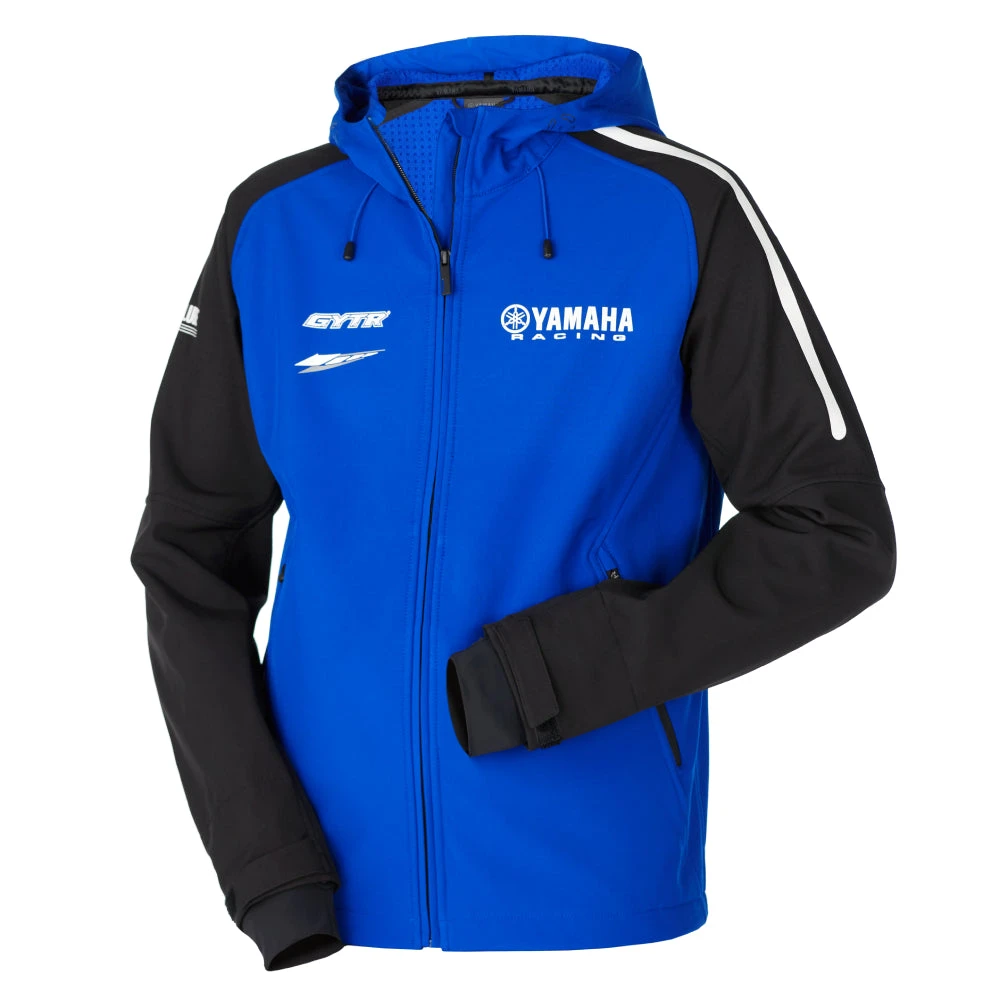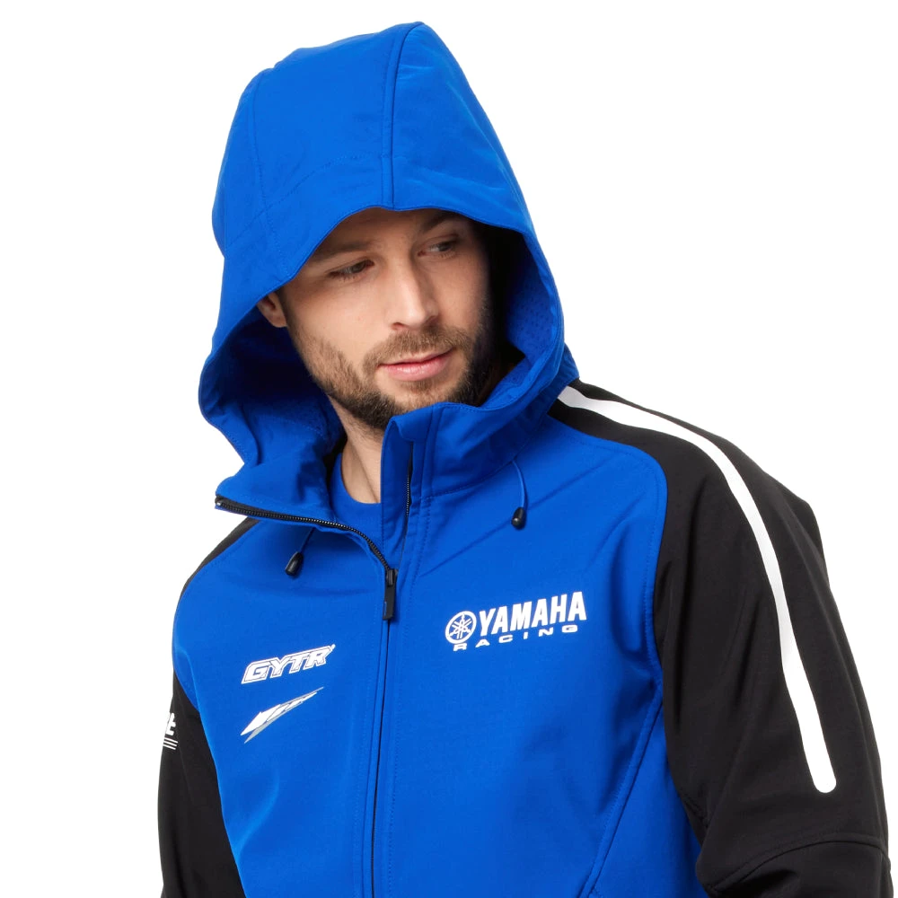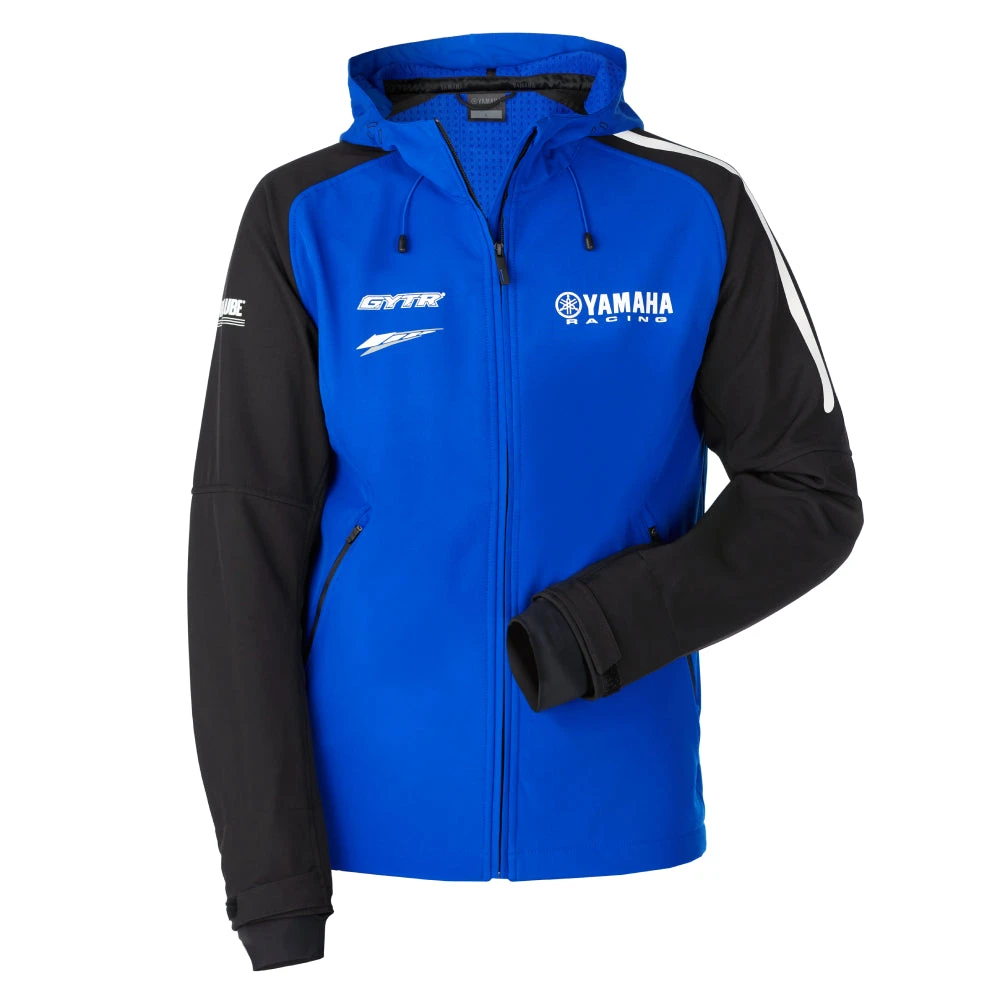 Yamaha “paddock blue” men’s softshell jacket. Oversized hood and thumbholes will keep you extra warm. Black sleeves featuring a white stripe down the left arm and white text on right arm and chest. Black stripe goes down from the bottom of the hood to upper back, ending with the Yamaha logo in white.