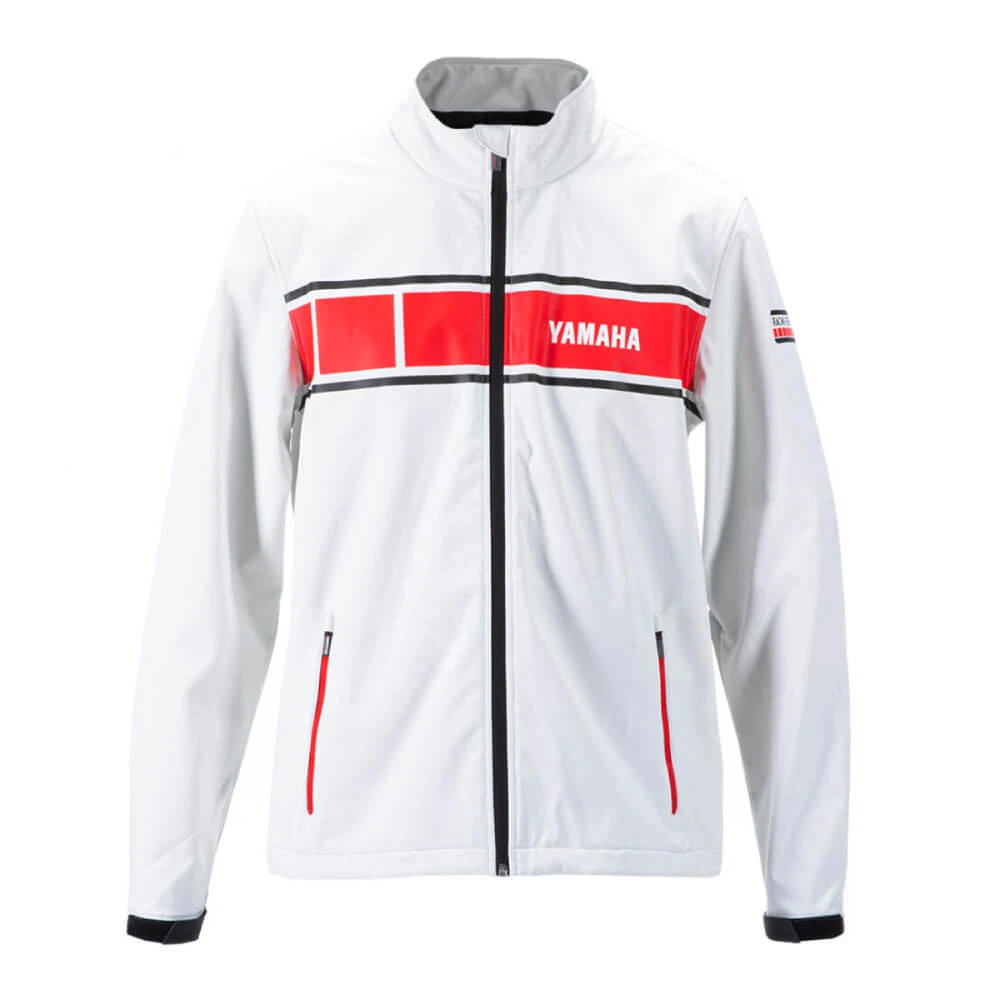 This men’s Yamaha Racing Heritage Softshell Jacket boasts a sleek design inspired by legendary Yamaha racing. Crafted from recycled polyester and elastane for maximum comfort and flexibility, the off-white softshell features a vibrant red speed block graphic on the chest. An internal fleece lining adds extra warmth, and the black zipper and red zipped pockets create a bold contrast. A strong white Yamaha logo on the chest and Yamaha Racing Heritage Club logo on the arm complete the look.