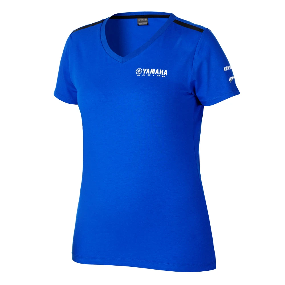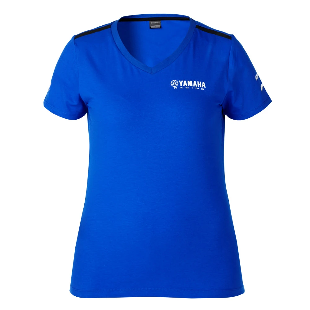 Genuine Yamaha “paddock blue” ladies’ short-sleeved t-shirt with white text on left of chest and left arm. Black stripe across both shoulders.